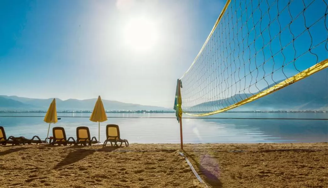 Plaža duga 2 km, sastoji se od tri peščane uvale i betonske platforme koja ih povezuje i okružuje celo poluostrvo. Ležaljke, suncobrani i peškiri za plažu su besplatni za goste hotela.